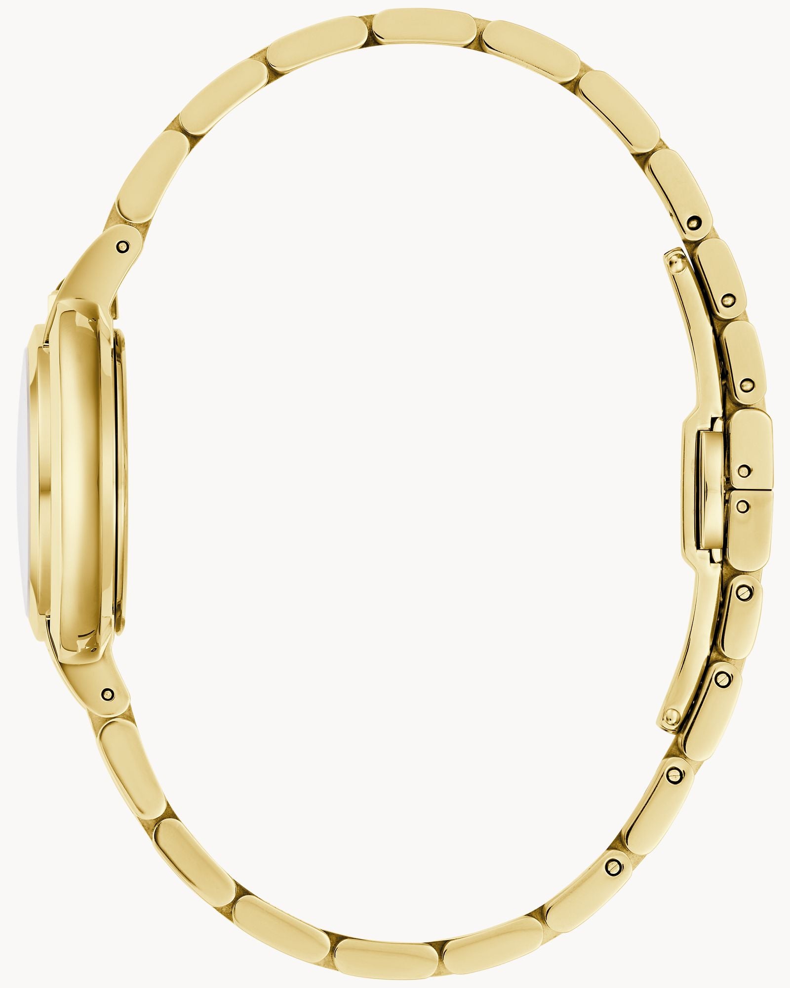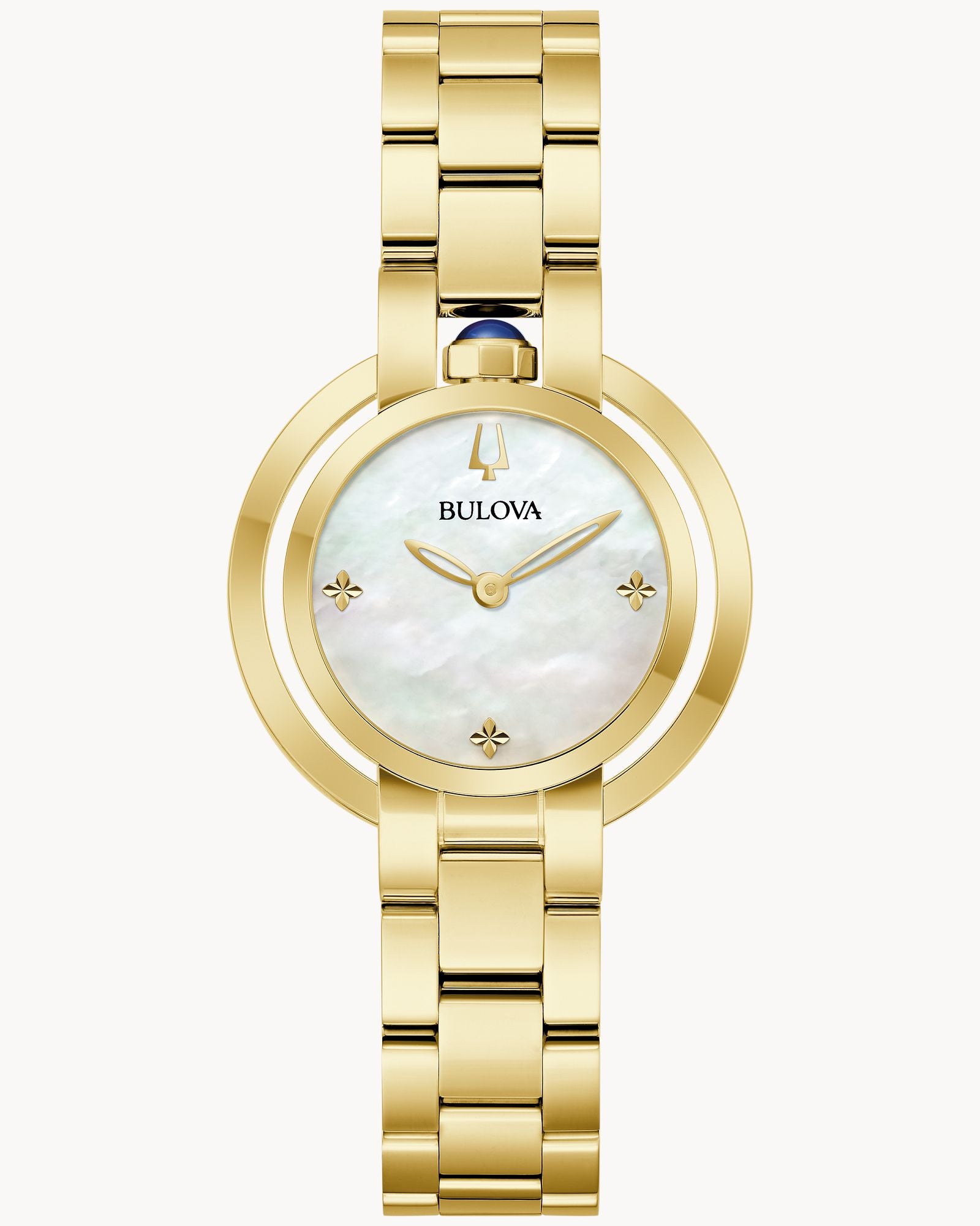 Reinventing legendary style, this Bulova women’s watch introduces a new petite model to the historic Rubaiyat collection. A synthetic blue spinel cabochon crown accents the 30mm gold-tone stainless steel case that features a sapphire crystal and a matching bracelet with a push-button deployant closure. Elegant gold-tone hands and faceted clover-shaped markers appoint the lustrous white mother-of-pearl dial. Enhance any ensemble, day or night, with this quintessentially feminine Bulova ladies’ timepiece.