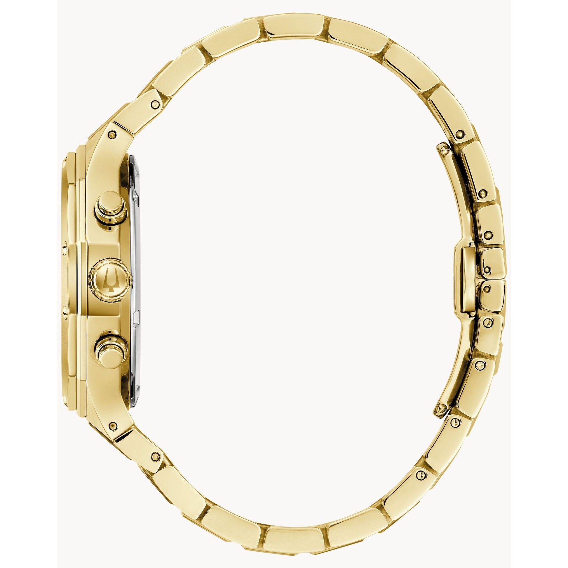 Bold, modern design characterizes this 6-hand chronograph from the Classic Bulova Prestige men’s collection. The watch features a faceted 40mm gold-tone stainless steel case with a geometric bezel, flat sapphire crystal with anti-reflective coating, 100m of water resistance, and a chamfered 3-link bracelet with a combination of brushed and polished finishes and a push-button deployant closure. The black textured dial with elegant striping has gold-tone hands and applied markers with Super-LumiNova luminescent fill, a date display, and gold-tone sub-dials including a 24-hour display. Highly functional with a distinctive design, this timepiece is suited for any occasion, from the everyday to the extraordinary.