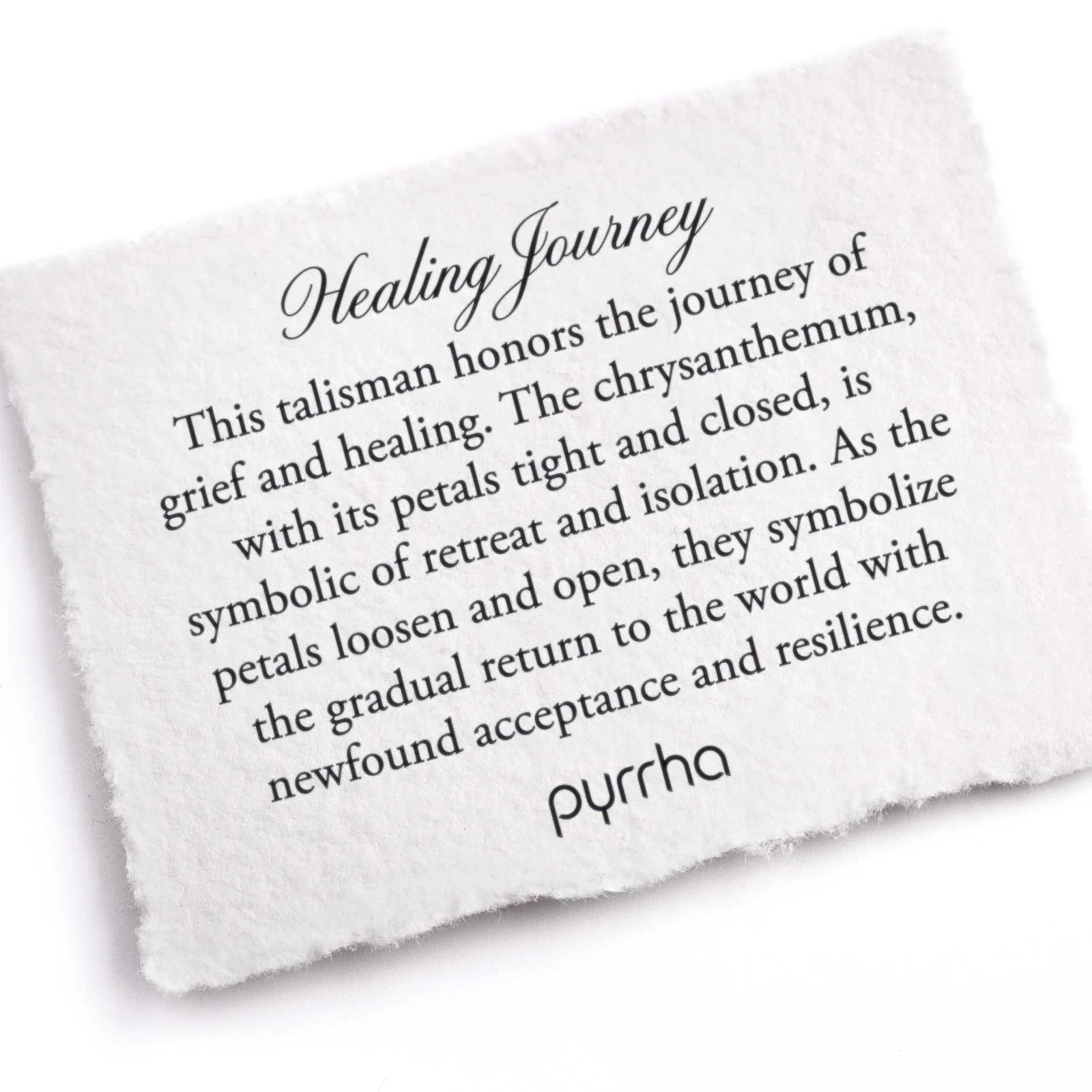 This talisman honors the journey of grief and healing. The chrysanthemum, with its petals tight and closed, is symbolic of retreat and isolation. As the petals loosen and open, they symbolize the gradual return to the world with newfound acceptance and resilience.
